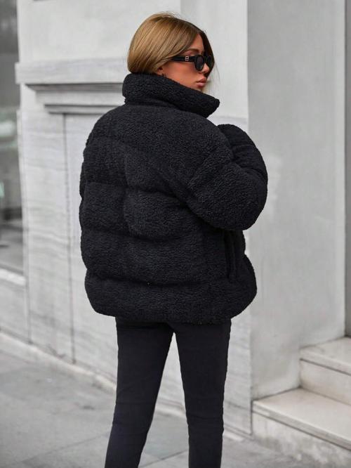 Yumuşacık dokusuyla hem konforu hem de şıklığı bir araya getiren dik yaka cepli kadın peluş mont , soğuk havalarda stilinden ödün vermek istemeyenler için ideal bir seçim.