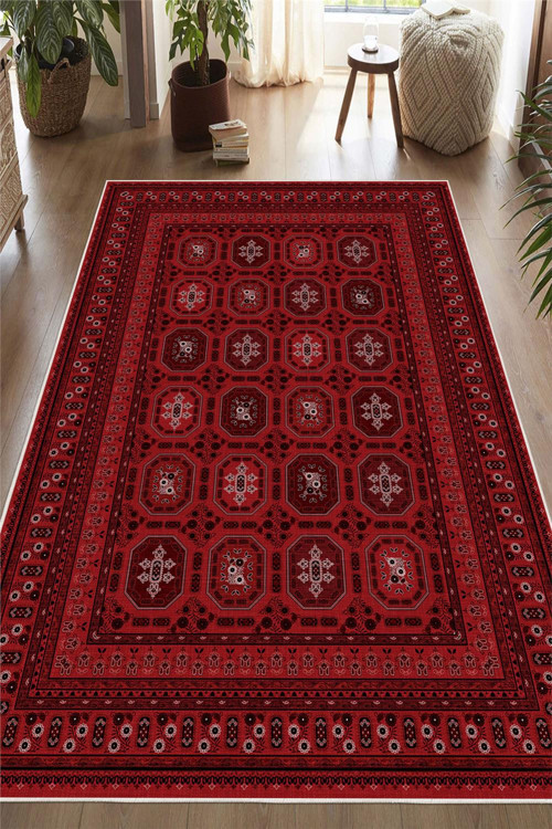 Bordo Afgan Desenli Dekoratif Kaymaz Taban Yıkanabilir Halı
