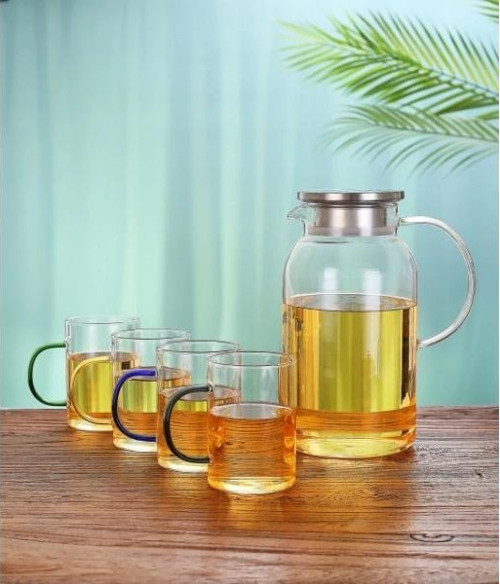 Büyük hacmi sayesinde su, meyve suyu, limonata, çay gibi çeşitli içecekleri rahatlıkla saklayabilir ve servis edebilirsiniz. Setin içindeki bardaklar farklı renklerde kulp detayına sahiptir, bu da estetik bir görünüm sunar ve kullanım keyfini artırır.