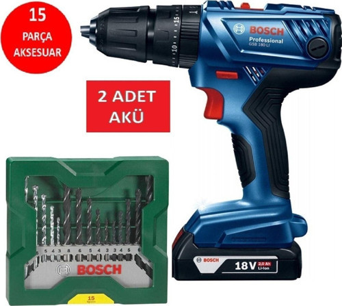Bosch Şarjlı Matkap Darbeli Matkap Çift Akülü 18V 2Ah Akülü Vidalama + 15 Parça Matkap Ucu Seti
