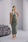 BOYUNDAN AKSESUARLI DEGAJE YAKA ELBİSE, CEMO markasının zarif ve modern çizgilerini yansıtan bir parça olarak öne çıkmaktadır. Bu elbise, hem günlük hem de özel davetlerde şıklığı arayan kadınlar için ideal bir tercihtir. Degaşe yaka tasarımı, zarif bir görünüm sunarken, boyundan aksesuar detayı ile de dikkat çekici bir stil yaratmaktadır.