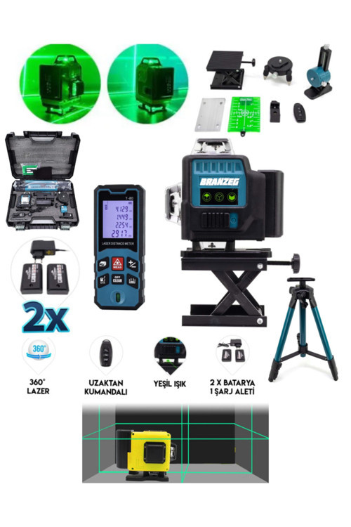 Branzeg 12 Yönlü Lazer Terazi Lazer Metre Seti Çizgi Hizalama Kumandalı Tripotlu BRANZEG LAZER TERAZİ + LAZER METRE & TRİPOT Profesyonel Lazer Terazi Seti, inşaat, tadilat, dekorasyon, mobilya montajı ve hassas ölçüm gerektiren tüm işlerinizde size milimetrik doğruluk sağlar.