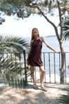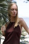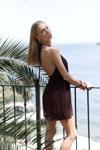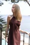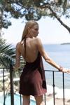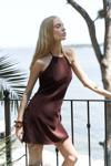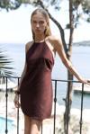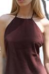 Boyundan bağlamalı, sırt dekolteli, gizli fermuarlı keten mini elbise.