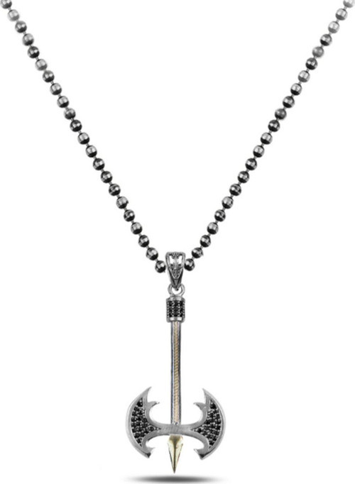 kararma yapmaz. faturalı ve sertifikalı üründür. gücün ve dengeli kararlılığın simgesi olan bu 925 ayar gümüş kolye, çift başlı balta tasarımıyla dikkat çeker. siyah taş detayları ve altın kaplama dokunuşlarıyla cesur bir stil sunar. özgüveni yüksek, savaşçı ruhlara hitap eden bu parça, stilinize güçlü bir ifade katacak.