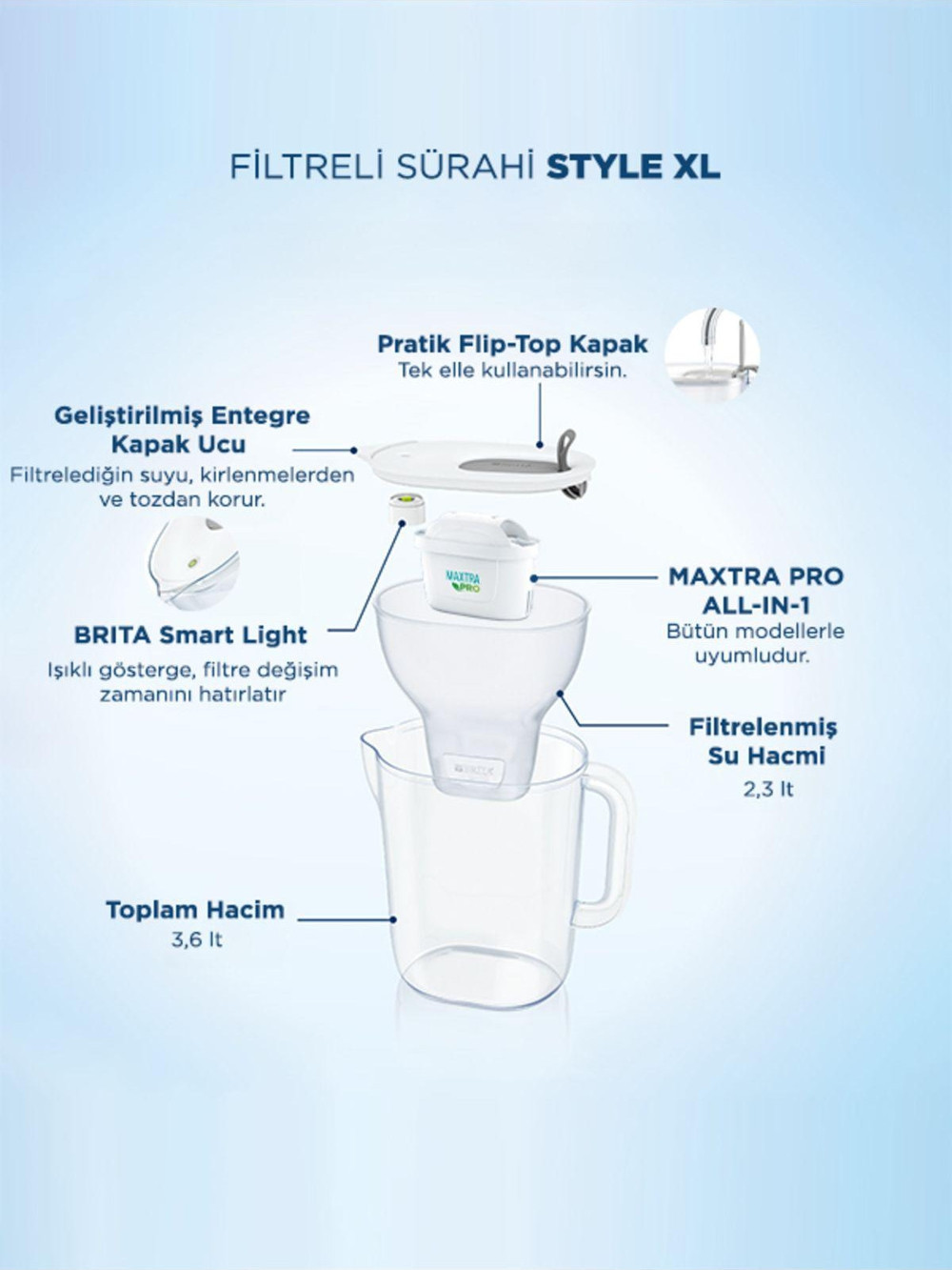 - Style XL Kapasitesi: 3,6 lt Toplam Hacim (2,3 lt filtrelenmiş su)