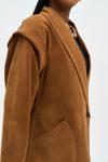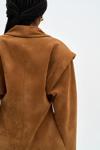 Düşük omuz, aller katlama detaylı, şal yaka, hafif bedene oturan formda, cepli düğmeli, asimetrik, süet blazer ceket.