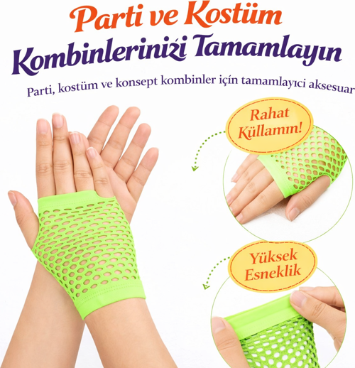 Retro neon yeşil file parmaksız kısa eldiven, enerjik rengi ve ikonik file dokusuyla kostüm ve sahne kombinlerine dinamik bir vurgu katar. 11 cm kısa boyu sayesinde bilekte modern ve sportif bir görünüm sunarken, parmakları açık yapısı el ve parmak hareketlerini özgür bırakır dans, sahne performansı ve etkinliklerde rahat kullanım sağlar. Esnek file dokusu farklı el ölçülerine kolayca uyum gösterir ve uzun süreli kullanımlarda konforlu bir deneyim sunar. Neon yeşil tonu, ışık altında dikkat çekici bir etki yaratarak fotoğraf çekimlerinde ve sahne üzerinde güçlü bir stil oluşturur. Özellikle 80’ler–90’lar temalı partiler, sahne gösterileri, dans etkinlikleri, festivaller ve kostüm organizasyonlarında öne çıkan bu eldiven, retro ruhu modern bir dokunuşla yansıtarak tarzını cesurca ifade etmek isteyenler için ideal bir aksesuardır.