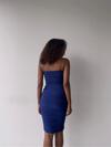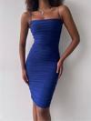 Mavi Midi İnce Askılı Drapeli Toparlayıcı Etkili Abiye Elbise