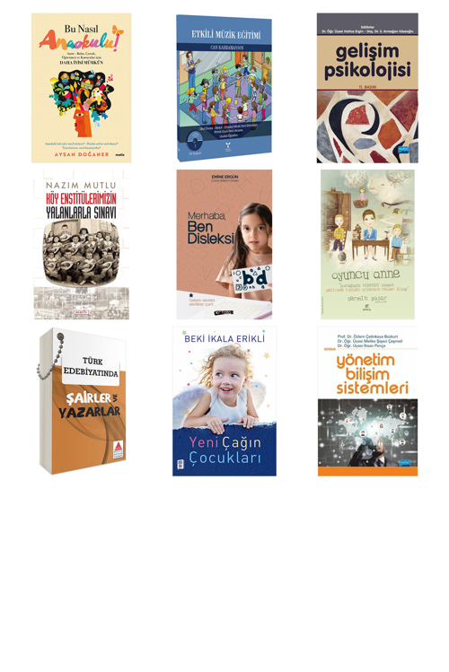 Bu Nasıl Anaokulu! - Etkili Müzik Eğitimi (CD Hediyeli) - Gelişim Psikolojisi - Köy Enstitülerimizin Yalanlarla Sınavı - Merhaba Ben Disleksi - Oyuncu Anne - Türk Edebiyatında Şairler ve Yazarlar Kartları - Yeni Çağın Çocukları - Yönetim Bilişim Sistemleri