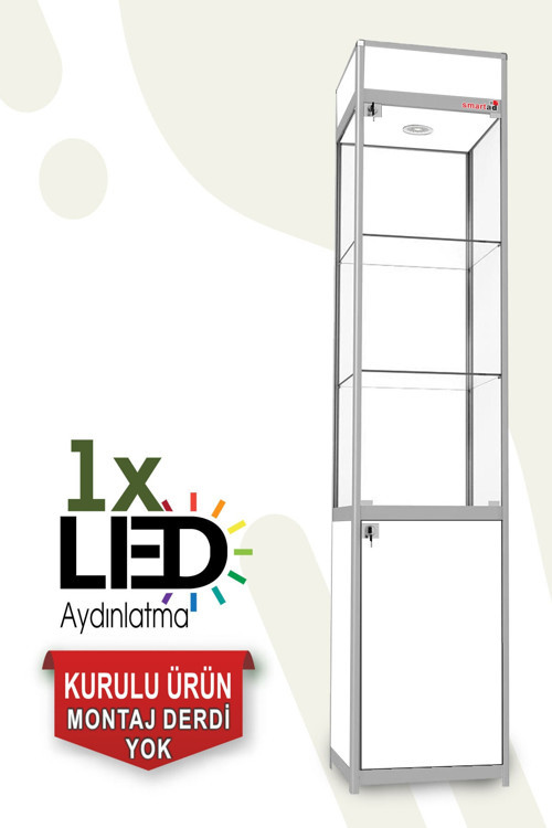 Camlı Vitrin • Yükseklik:200cm, Genişlik:80cm, Derinlik:40cm • 1 Adet Spot • 3 Adet Raf + Alt Dolap • Alüminyum eloksal çerçeve • Krom kaplı köşe • Yekpare cam • Mıknatıslı ve kilitli cam kapak • Ayarlanabilir raf yüksekliği • Raf ve kapak cam kalinligi 5mm • Yan ve arka cam kalınlığı 4mm Kupa Dolabı, Koleksiyon Dolabı, Model Araba Dolabı, Teşhir Dolabı, Müze Vitrini olarak Kullanabilirsiniz