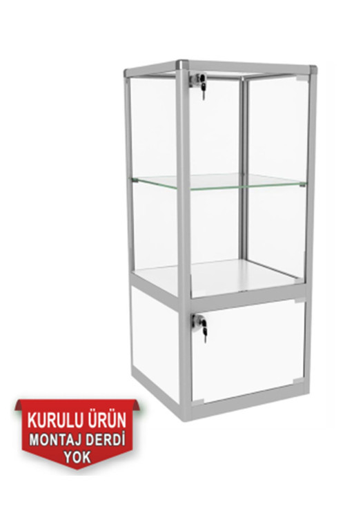 • Yükseklik:950, Genişlik:400, Derinlik:400 mm • 1 Adet Raf + Alt Dolap • Alüminyum eloksal çerçeve • Krom kaplı köşe • Yekpare cam • Mıknatıslı ve kilitli cam kapak • Ayarlanabilir raf yüksekliği • Raf ve kapak cam kalinligi 6mm • Yan ve arka cam kalınlığı 4mm • Raf taşıma kapasitesi 10kg'dır.