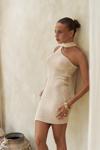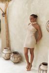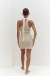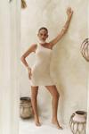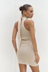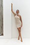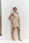 Pamuk karışımlı, asimetrik tek omuz kalın ip bağlama detaylı mini triko elbise.