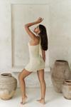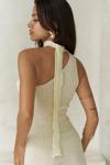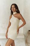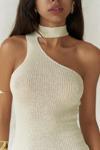 Pamuk karışımlı, asimetrik tek omuz kalın ip bağlama detaylı mini triko elbise.
