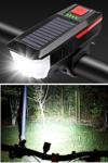 BUFFER® Solar Enerjili USB ile Şarj Edilebilir Ledli Bisiklet Feneri Kornalı ve Su Geçirmez Far