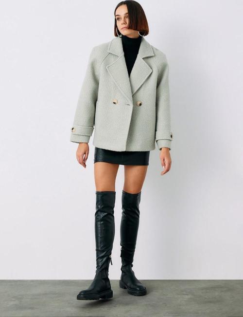 Ön düğmeli kapama, geniş ceket yaka, geniş kemerli kol, iç astarlı, buklet kısa kaban.
