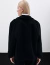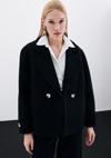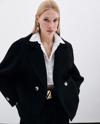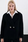 Ön düğmeli kapama, geniş ceket yaka, geniş kemerli kol, iç astarlı, buklet kısa kaban.