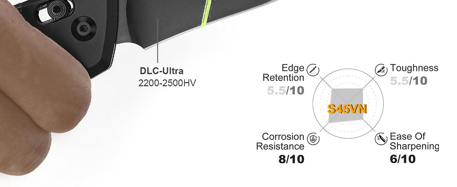 S45VN çeliği, selefine kıyasla olağanüstü kenar tutuşu (HRC 60-61) ve gelişmiş dayanıklılık sunarak zorlu kesme işleri için idealdir. İnce tane yapısı için eklenen niyobyum ile daha iyi korozyon direnci ve daha kolay bileme sağlar. İster dış mekan ister EDC kullanımı için olsun, S45VN uzun ömürlü performans sağlar.