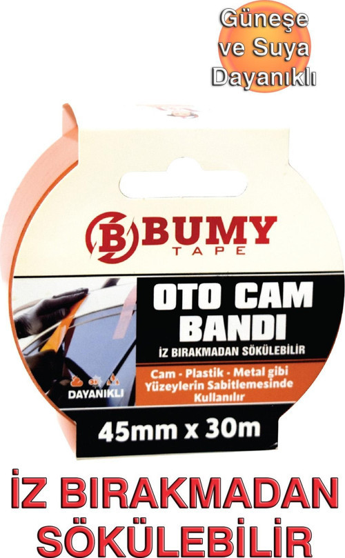 - Bumy Oto Cam Bandı, doğal kauçuktan imal edilen özel tutkal yapısı sayesinde yapıştığı yüzeyden tutkal kalıntısı bırakmadan sökülebilir.