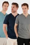 Buratti Pamuklu Düğme Detaylı Slim Fit V Yaka 3'lü Paket Erkek T Shirt 5902122S3 İndigo-Açık Mavi-Açık Haki