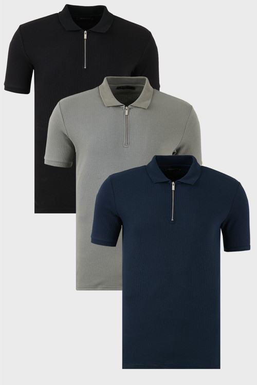 Buratti Pamuklu Regular Fit Yarım Fermuarlı 3'lü Paket Erkek Polo Yaka T Shirt 5902738S3 Siyah-Açık Haki-İndigo