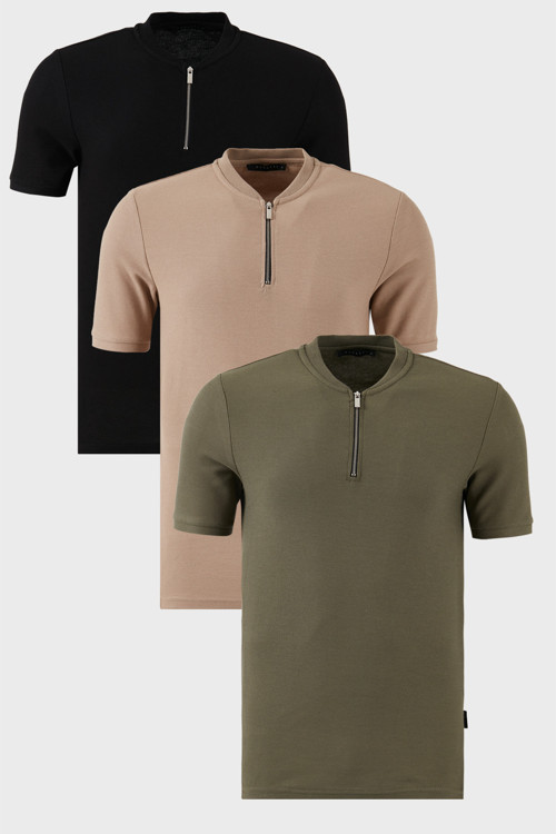 Buratti Pamuklu Regular Fit Yarım Fermuarlı Kolej Yaka 3'lü Paket Erkek T Shirt 5902653S3 Siyah-Vizon-Haki