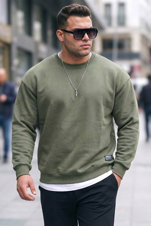 Regular Fit Bisiklet Yaka Pamuklu İçi Tüylü Yumuşak Şardonlu Erkek Sweat 5905255 HAKİ