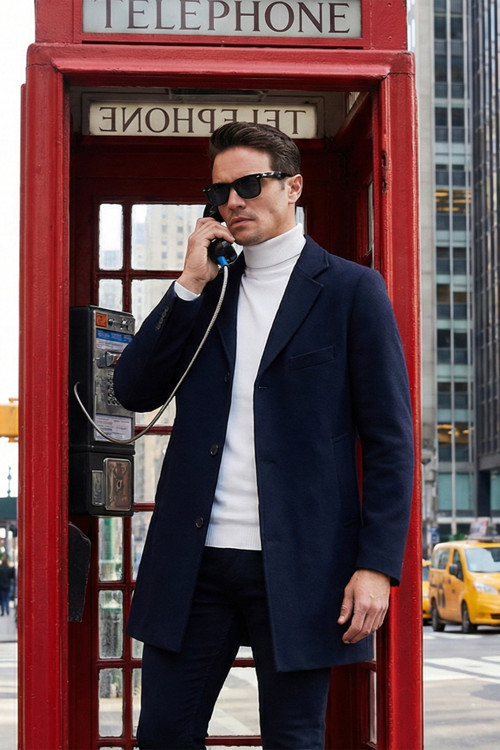Slim Fit Tek Yırtmaçlı Düğmeli Mono Yaka Kaşe Erkek Kaban 5840098 LACİVERT