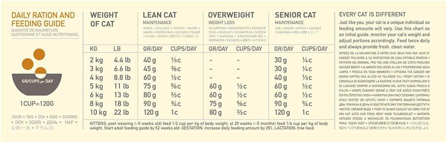 ACANA’dan tüm ırk ve yaş evrelerindeki kediler yararlanabilir. Aynı sizin gibi kediniz de kendine hastır ve beslenme gereksinimleri çevreye, yaşa ve aktivitelerine göre değişiklik göstermektedir. Aşağıdaki tablo ihtiyaca göre ayarlanacak şekilde, bir başlangıç noktası sağlamaktadır. Kedinizi günde iki kez besleyiniz ve her zaman yanında temiz su bulundurunuz.
