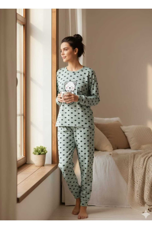 Yumuşak Dokunuş, Maksimum Esneklik: Kadın Mint Yeşili Ayı Figürlü Puantiye Desenli Fitilli Pijama Takımı Ev giyiminde hem sevimli bir tarz hem de üstün konfor arayanlar için özel olarak tasarlanan bu takım, mint yeşilinin huzur veren tonuyla uykularınıza eşlik ediyor.