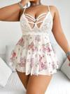 ? Büyük Beden Beyaz Üstüne Çiçek Desenli Dantel İşlemeli İnce Askılı Mini Gecelik