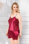 Büyük Beden Bordo Saten Gecelik Babydoll Şort Takımı