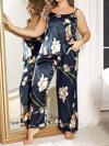 Büyük Beden Mavi Üstüne Çiçek Desenli İnce Askılı 2'li Saten Pijama Takımı, yumuşacık saten dokusu ve çiçek desenlerinin romantik havasıyla rahatlığın en şık hâlini sunuyor.
