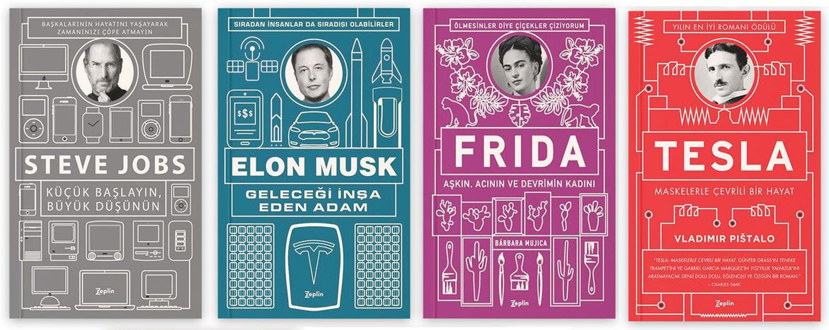 Zeplin Yayınları'nın popüler biyografi serisi şimdi 4 kitaplık set halinde. Elon Musk, Tesla, Steve Jobs gibi bilim dünyasının dahilerinin yanında sanat dünyasının en sevilen isimlerinden Frida Kahlo da var.