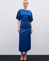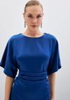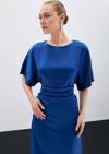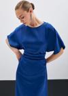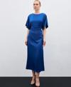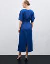 Bisiklet yaka, geniş kısa kol, arka fermuar ve yırtmaç detaylı, midi boy, büzgü detaylı krep saten elbise.