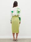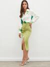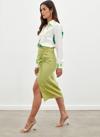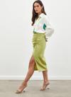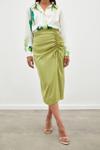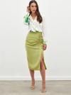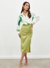 Yüksek bel, arka fermuarlı kapama, yırtmaçlı, diz altı boy, büzgü detaylı, süs bağlamalı, saten etek.