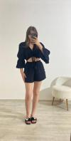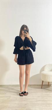 Yaz gardırobunuzun enerjisini yükseltecek bu ikili takım; hem şıklığı hem rahatlığı bir arada sunuyor! Haki rengin doğallığıyla bütünleşen hafif, nefes alan kumaşıyla gün boyu konfor sağlarken, modern tasarımı ile dikkat çeker. Göğüs kısmı büzgü detaylı crop bluz, geniş kolları ve bağlama detayıyla feminen bir hava katarken, yüksek bel şort ise lastikli yapısıyla vücuda uyum sağlar.