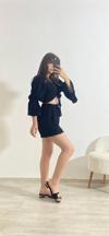 Üst Parça: V yaka, bağlamalı crop, balon kol