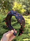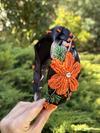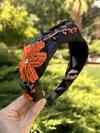 - Siyah kumaş üzerine turuncu çiçeklerle zarif bir tasarıma sahiptir.