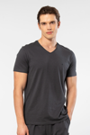 V yaka, kısa kollu, düz t-shirt. Rahat kalıbı ve kaliteli kumaşıyla rahatlığı ön planda tutan şık