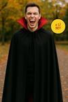 120 cm siyah pelerin kırmızı yakasıyla asil ve korkutucu bir hava katarken, takma vampir dişleri görünümünüzü tamamlar. Hem yetişkinler hem çocuklar için uygundur, kolayca takılıp çıkarılır.