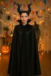 Cadılar Bayramı Malefis / Maleficent Boynuzlu Taç ve 120 cm Yakal Pelerin Kostüm Seti