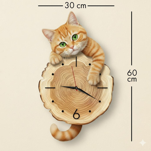 Caju Art & Decoration CajuArt Kütük Üzerinden Bakan Sarman Kedi Tasarımlı Duvar Saati Modern Dekoratif Saat