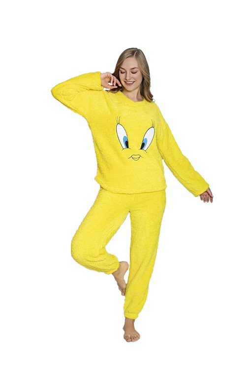 Sarı kuş desenleriyle süslenmiş, göz alıcı bir görünüm sunan pijama takımı, evde şıklığı ve rahatlığı bir arada yaşamanızı sağlar; Tam peluş kumaşı sayesinde yumuşak dokunuşu ve sıcak tutma özelliği ile konforlu bir uyku deneyimi sunar; Desenli tasarımı ile hem göze hitap eder hem de ev giyiminde renkli bir dokunuş yaratır;