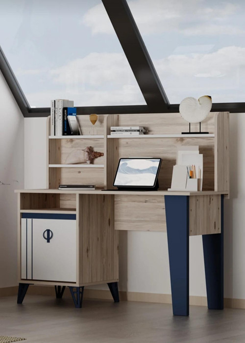 Fonksiyonelliği ve estetiği bir araya getiren bu çalışma masası, çocuk ve genç odaları için hem pratik hem de dekoratif bir çözüm sunar. Ahşap görünümlü gövdesi ve mavi detaylarıyla odalara enerjik bir hava katar.