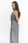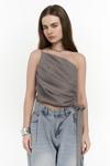 Tek omuz askılı, asimetrik kesim crop. Önü katlamalı tasarım, yanda ayarlanabilir aynı