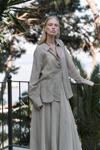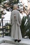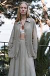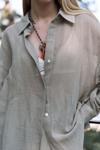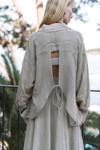 | Sırt dekolteli ve bağcıklı, uzun kol, transparan keten karışımlı oversize gömlek. |