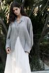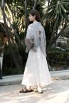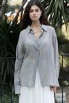 Sırt dekolteli ve bağcıklı, uzun kol, transparan keten karışımlı oversize gömlek.