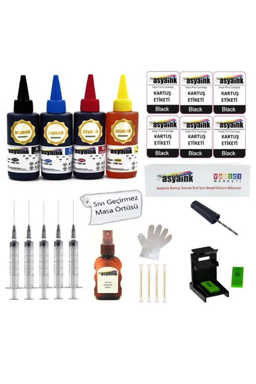 4 Renk PAKET İÇERİĞİ ; 100 ML Black -Siyah Mürekkep 100 ml cyan-mavi mürekkep 100 ml magenta-kırmızı mürekkep 100 ml yellow-sarı mürekkep 1 Adet Kartuş Vakum/Dolum Aparatı (2 Adet Yeşil Conta Gönderilir Siyah ve Renkli Kartuşlarınız için) 1 Adet Kartuş Temizleme Spreyi 4 adet Kartuş Dolum Şiringası (Enjektör) 1 Çift Uygulama Eldiveni 6 Adet Kartuş Dolum Etiketi 1 Adet Kartuş Delme Aparatı Asyaink Kartuş dolum seti ile baskı maliyetlerinde inanılmaz tasarruflar sağlarsınız. Videoda gördüğünüz şekilde uygulaması gayet basittir.Bir kere pratik yaptığınızda sornasında 2 dakika içinde kolayca kartuşunuzu doldurabilirsiniz. Setin içerisinde ihtiyacınız olan tüm malzemeler bulunmaktadır. Evinizde işyerinizde kolayca dolum yapabilirsiniz. Kartuş dolumu için kartuşun üzerinde açacağınız (Set içeriğinde delici matkap uç gönderilmektedir.) delikten kolayca dolumu mümkündür. 4x100 Ml olarak gönderdiğimiz mürekkep şişelerimizin uç kısmında fabrikasyon folyo bulunur. Taşıma esnasında akma , patlama gibi sürprizlerle karşılaşmazsınız. Marka tescilli Asyaink mürekkepleri ile gerçek ton ve kaliteyi ucuza almanın tam vakti. Asyaink Mürekkepleri diğer taklit markalar gibi donma tıkanmaya sebep olmaz. Yüksek vizkozitesi sayesinde süngere ve kartuşa zarar vermez. Süratle kurur kağıtta dağılmaz. Fotoğraflarınızda gerçek tonları ve uzun süre solmaz. Set içeriğinde gönderilen “Kartuş Temizleme Spreyi” hem kartuş ağız (Nozzle) da kurumayı açar hem de kartuş etrafına dağılan bulaşan mürekkebi (Kartuş etrafında) temizlemeye yardımcıdır. Gerçek Asyalı Mürekkep Kartuş Dolumlarında, kartuşlarda, sürekli besleme sistemlerinde rahatlıkla kullanılır. Uyumlu Yazıcılar; Canon Pixma MX 490Canon Pixma MX 495Canon Pixma MG 2950Canon Pixma MG 2900Canon Pixma MG 2450Canon Pixma MG 2500Canon Pixma MG 2550Canon Pixma MG 2400Canon Pixma MG 2455Canon Pixma MG 2555Canon Pixma IP 2850Canon Pixma IP 2800