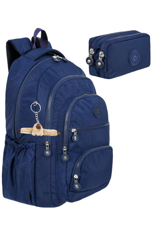 Çantaland 2'Li Set Lüx Krinkıl Kumaş Lise Ve Ortaokul Sırt Çantası + Kalemlik, Maymun Anahtarlık Hediyeli