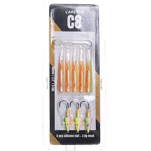 Caretta C8 Silikon Yem Seti ile avcılığın tadını çıkarın! Bu set, 5 adet silikon yem ve 3 adet jig head içermektedir. Yumuşak gövde yapısı ve esnek kuyruğu, yemlere doğal bir hareket kazandırarak su altında gerçek bir balık hissi uyandırır. Yüksek kaliteli boyası ve dikkat çekici renk seçenekleri sayesinde tüm avcı balıkların ilgisini çeker. Özellikle levrek, lüfer, turna ve sudak gibi avcı balıklar için mükemmel bir tercih olan Caretta C8, zor koşullarda bile etkileyici performans sergiler.